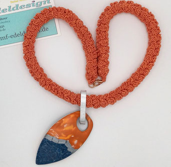 handgehäkelte viereckige Kette Orange mit Karabiner-Verschluss Edelstahl goldfarben und Kettenanhänger aus Polymer Clay mit Mattglanzfinish, farblich dem